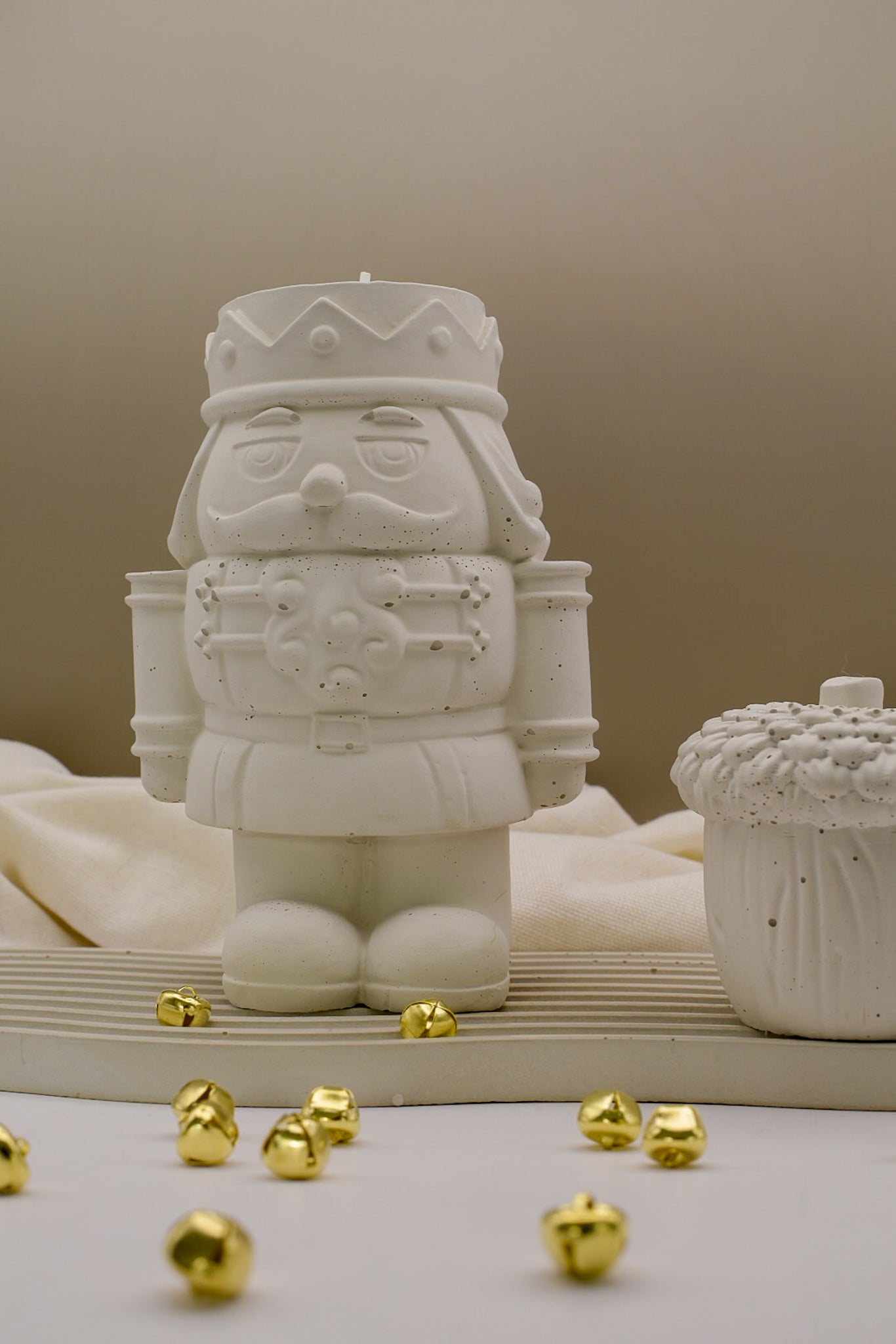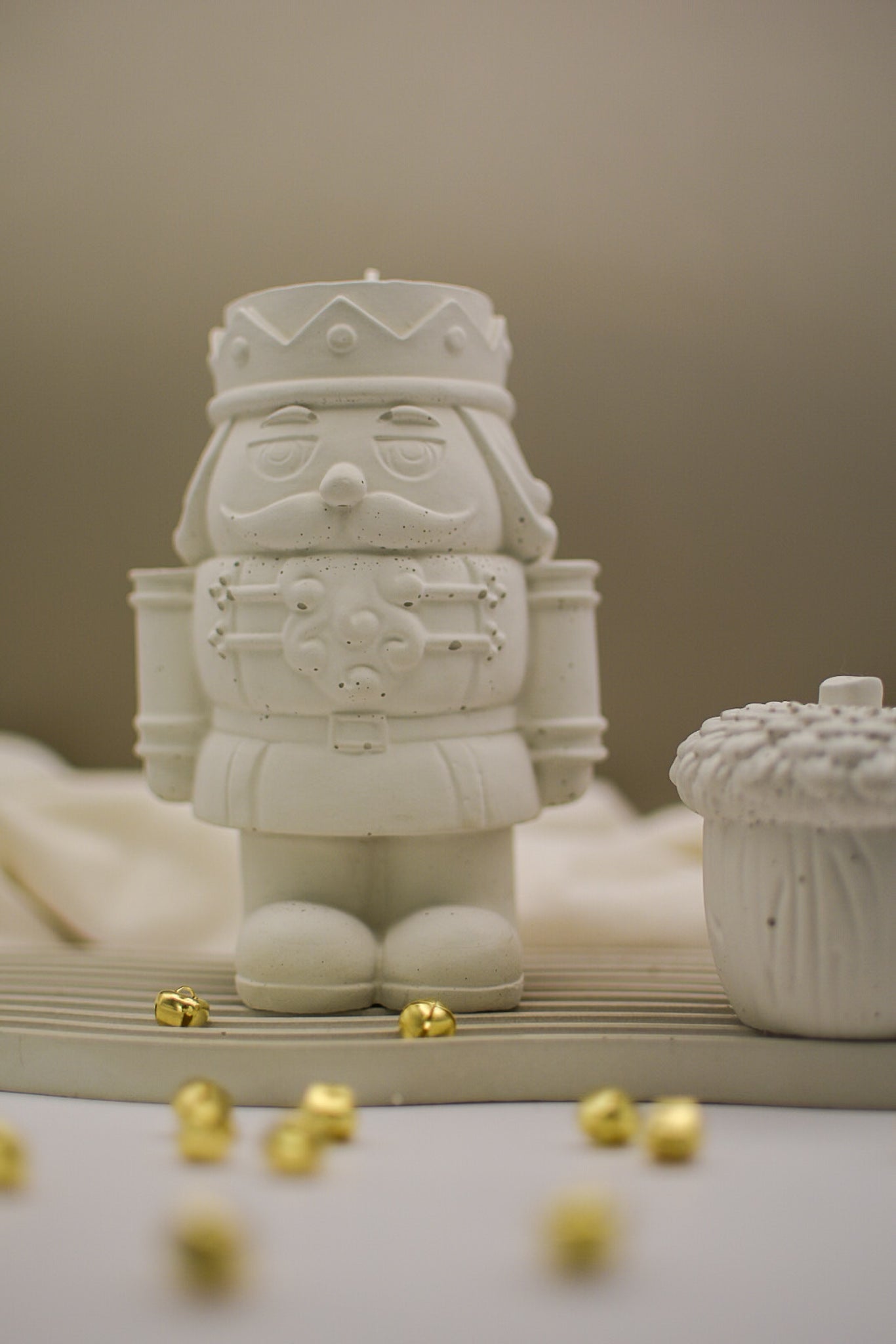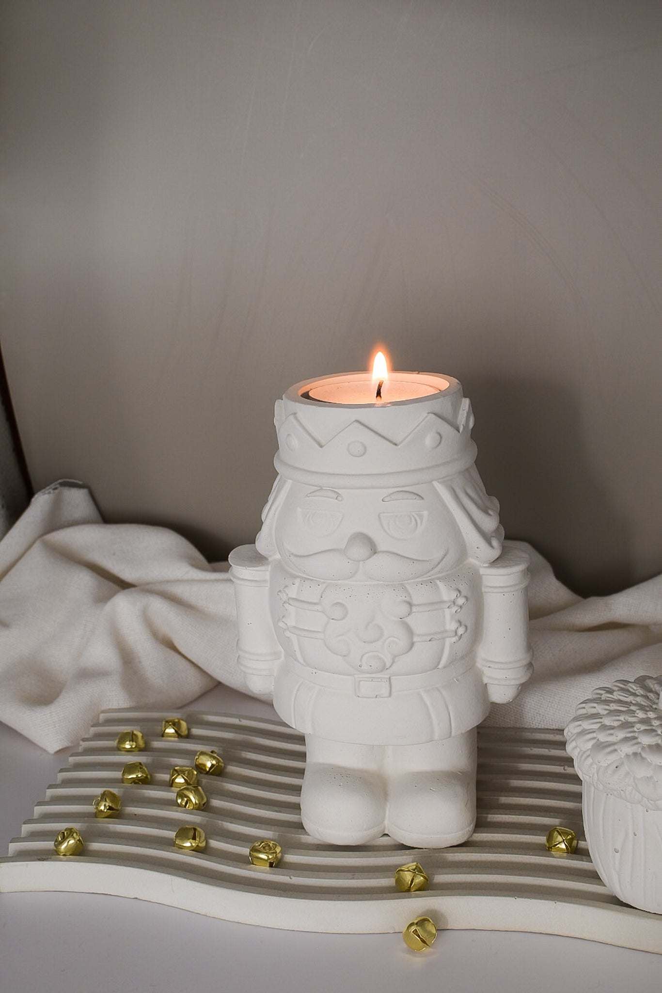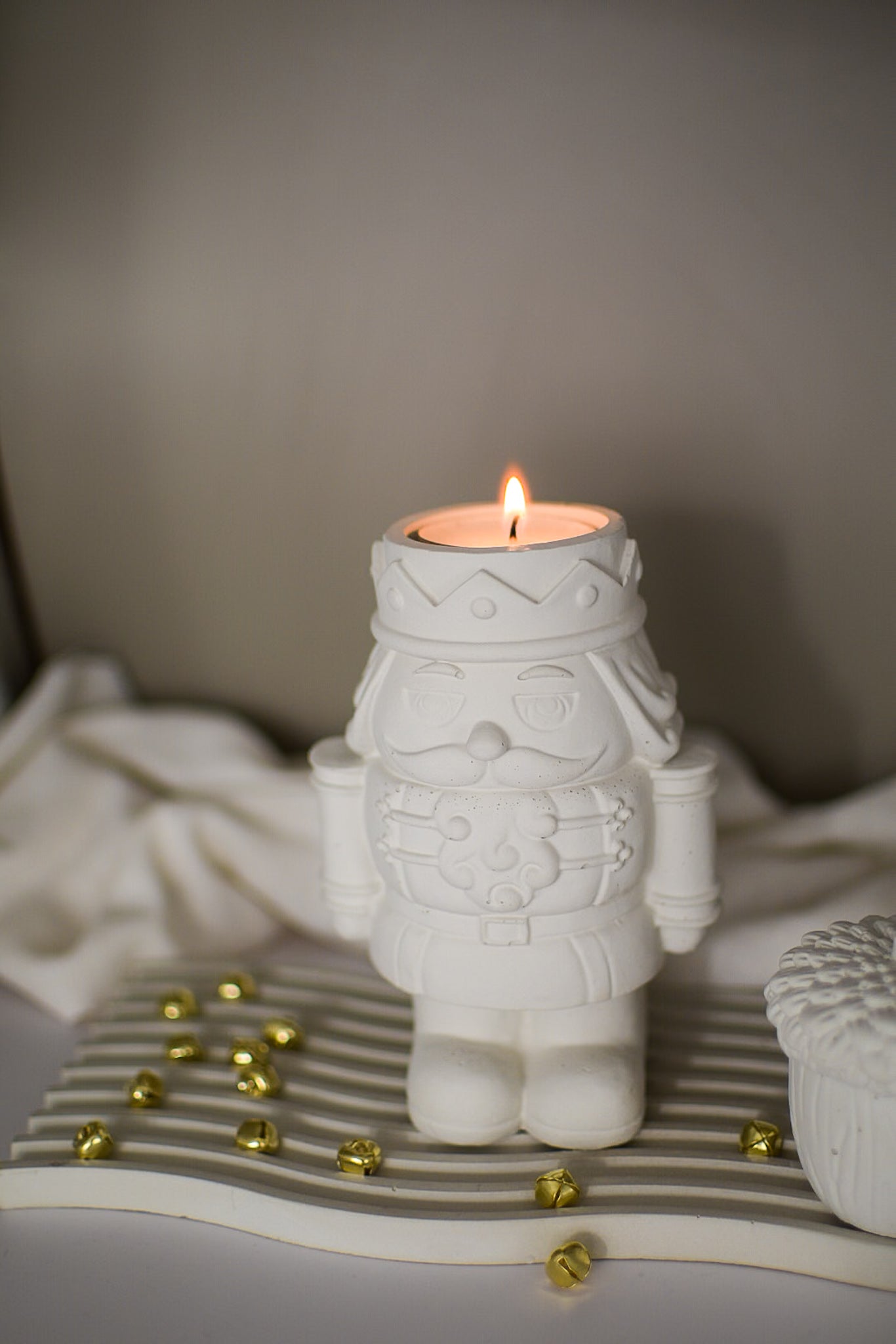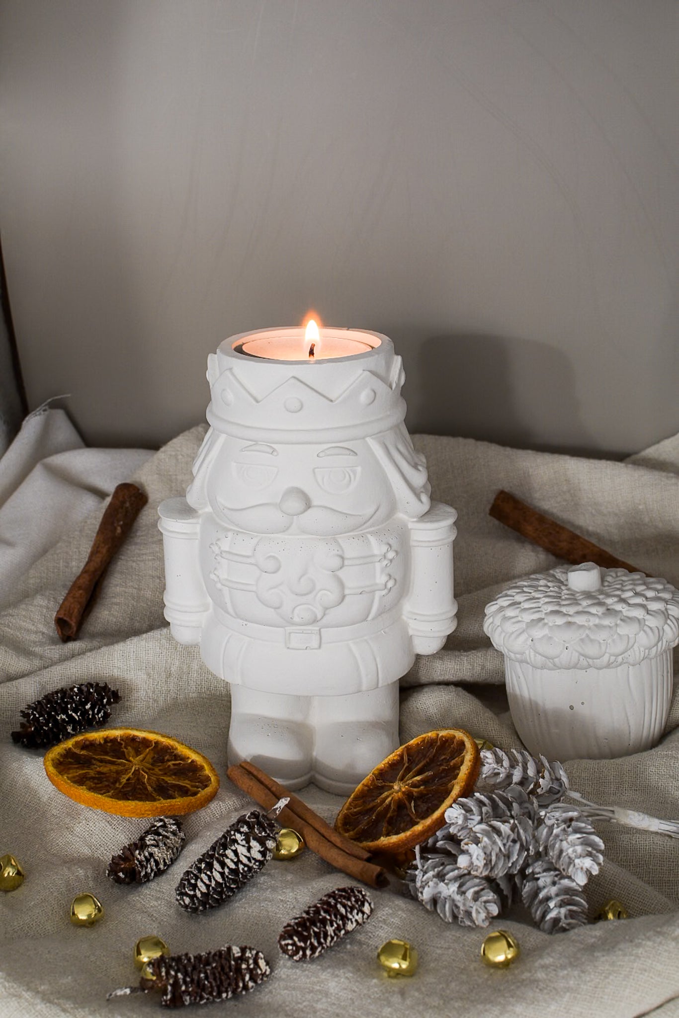Dieser Nussknacker-Teelichthalter aus hellem Feinbeton verbindet schlichte Eleganz mit winterlicher Gemütlichkeit.